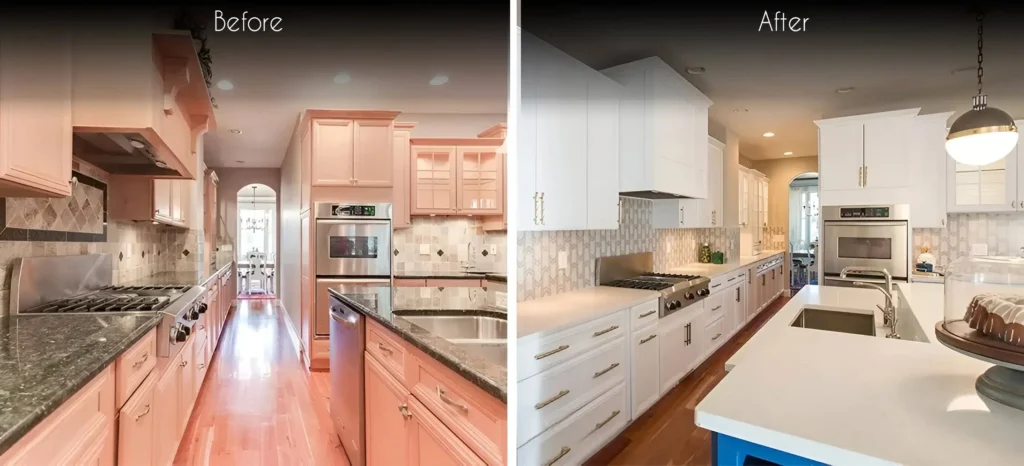 After: The transformation is dramatic. We replaced the old cabinetry with crisp white Shaker-style doors, which offer a cleaner, more timeless look. For contrast, the new central island features a deep navy blue base. The dark countertops were swapped for a brilliant white quartz, instantly reflecting light and making the space feel larger and more open.